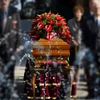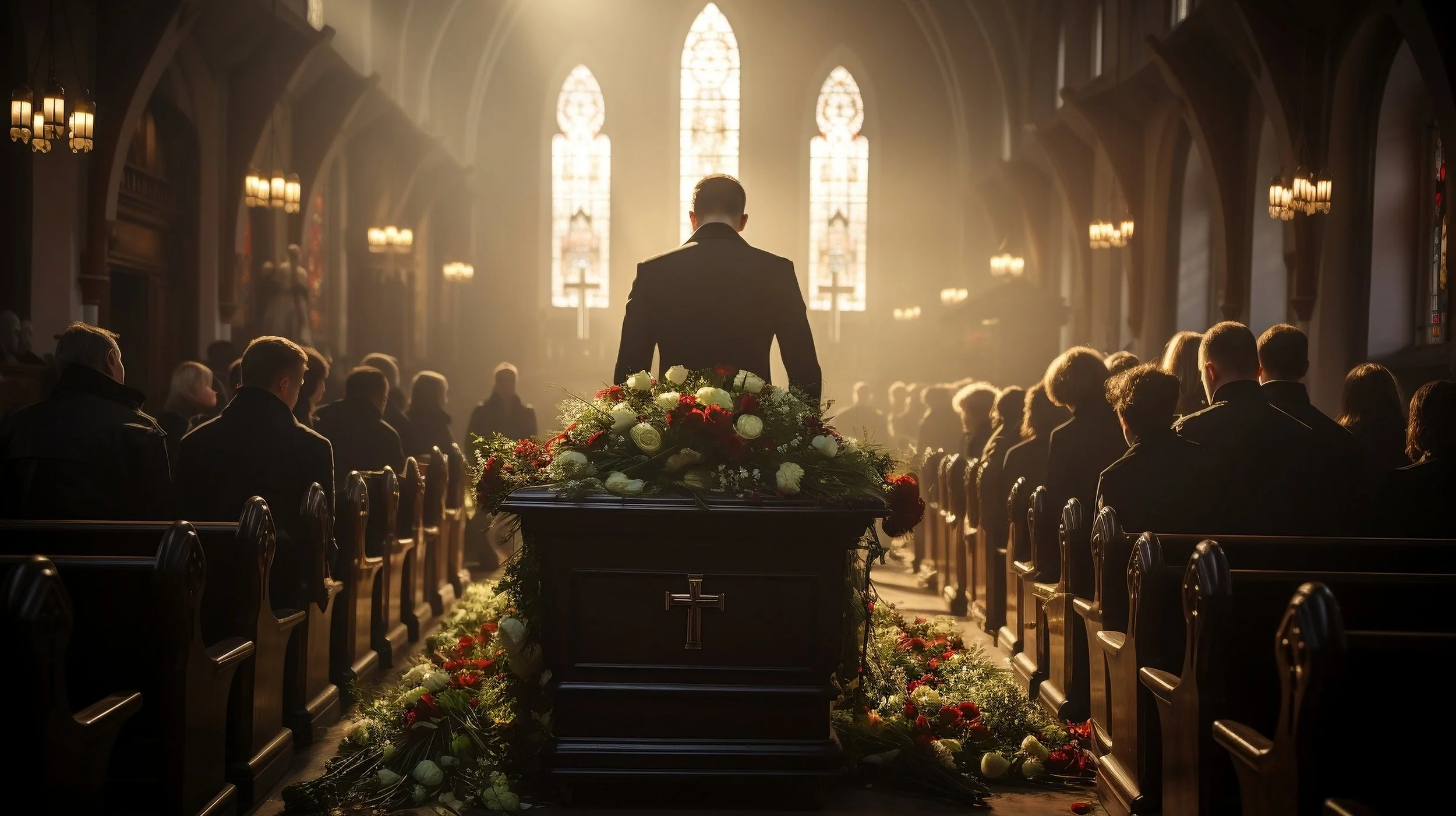 A man standing at a casket decorated with flowers inside a church during a funeral service, with mourners seated on both sides and stained glass windows in the background.