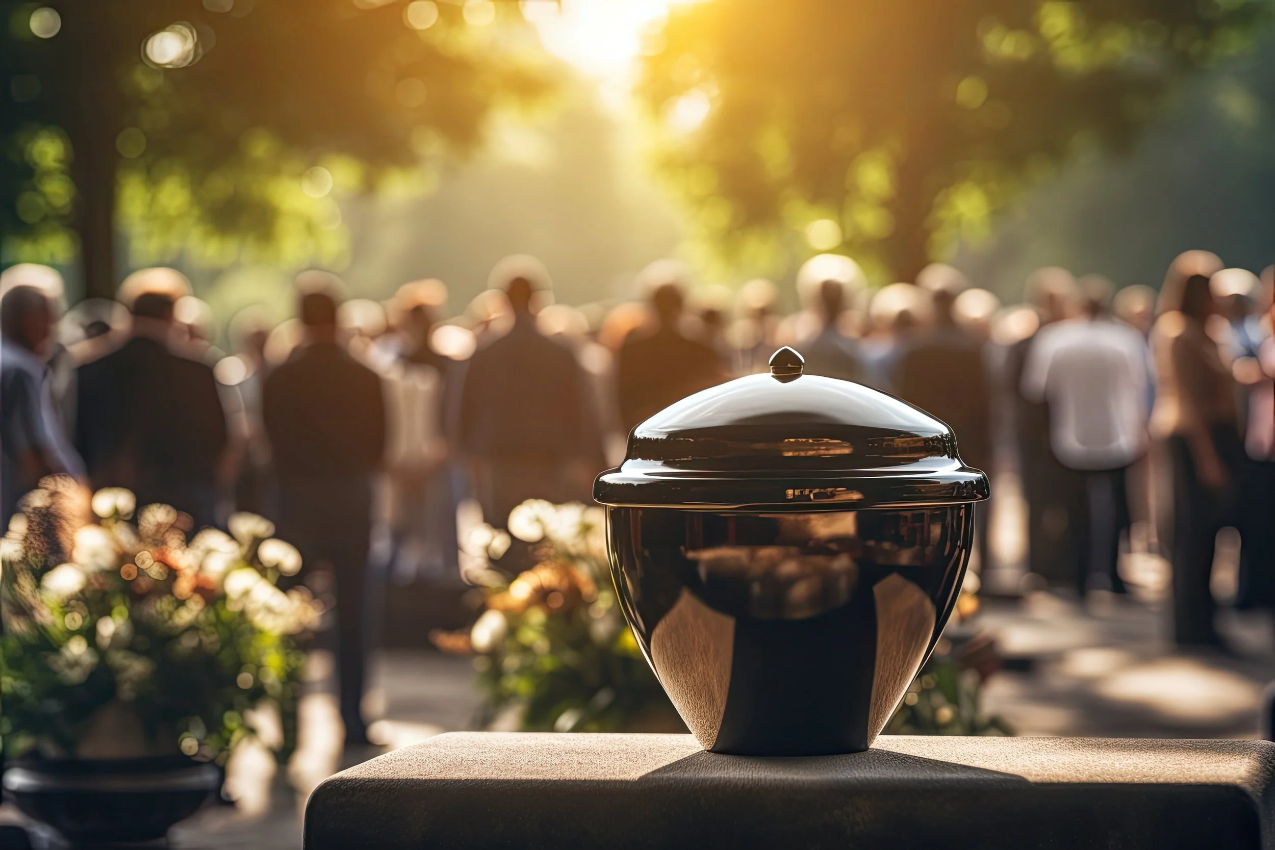 A black urn on a table with a blurred background of people gathered outdoors in sunlight.